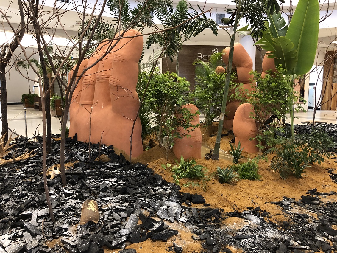 A exposição em tamanho real ganhou forma com galhos queimados, árvores, carvão em cinzas. Os animais empalhados foram cedidos pelo Mastozoologia & Vertebrados Terrestres da UNIR. As mãos gigantes foram produzidas pelo Artista Plástico, Bruno Alves de Souza e o paisagismo por Thulio Castro. O projeto conta com o apoio do Grupo Eletrosat, Antônio Araújo Reformas, Casa das Plantas e Emdur.