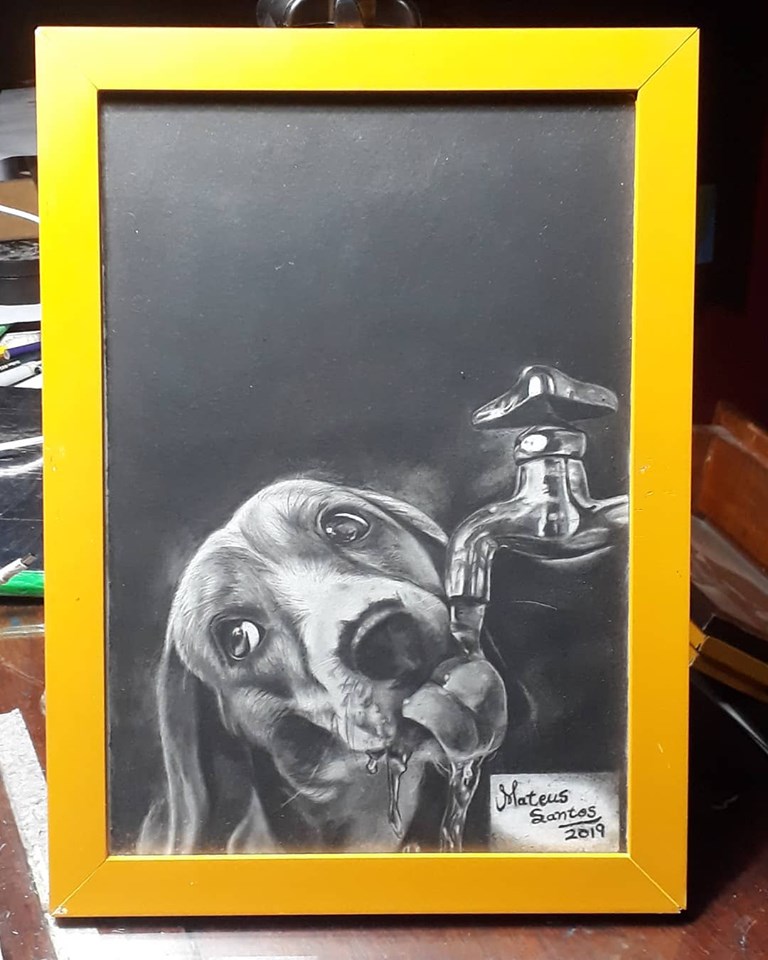 Mateus definiu a sua arte como desenho realista, feita tanto com grafite quanto com lápis de cor. Usando esses materiais, ele faz os quadros retratando pessoas, animais e a natureza em geral.