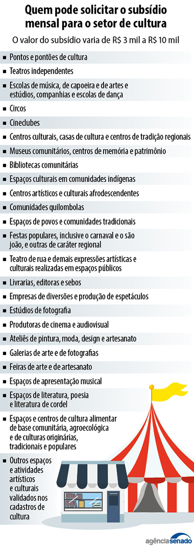 O projeto lista 25 exemplos de espaços culturais aptos a pleitear o subsídio mensal, tais como teatros independentes; escolas de música, dança, capoeira e artes; circos; centros culturais; museus comunitários; espaços de comunidades indígenas ou quilombolas; festas populares, inclusive a cadeia produtiva do Carnaval; e livrarias. Não poderão receber o auxílio aqueles vinculados à administração pública ou criados ou mantidos por grupos de empresas ou geridos pelos serviços sociais do Sistema S.