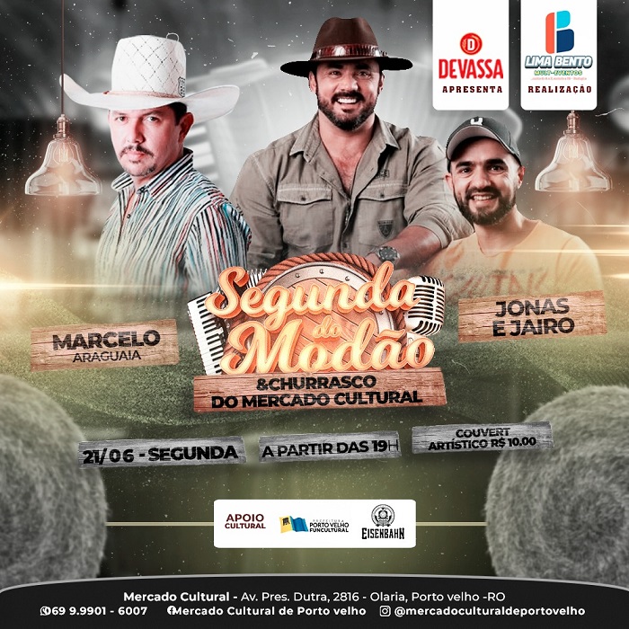 Nesta segunda-feira, 21, tem modão de viola com os artistas rondonienses Marcelo Araguaia e a dupla Jonas & Jairo. O show intimista será no Mercado Cultural, a partir das 19 horas.