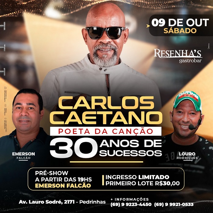 Com canções gravadas por grandes nomes da música brasileira, o compositor e poeta carioca @carloscaetanopoeta (Poeta da Canção)se apresenta em Porto Velho sábado,9, no Gastrobar, na Avenida Lauro Sodré. Terá pré-show de Emerson Falcão e Louro Rodrigo a partir das 19h30. Já o show do artista carioca começa às 20h30.