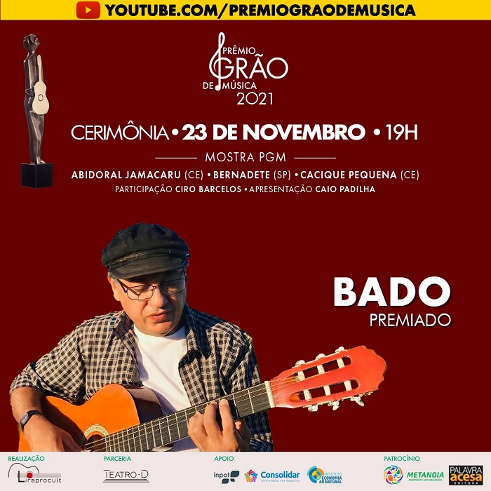 O Prêmio Grão de Música realiza sua 8ª edição nesta terça-feira,23, às 19h (Horário de Brasília) e um dos contemplados é o cantor, compositor e instrumentista rondoniense Bado com a música "Mundos". O evento celebra a canção brasileira com shows, performances e a entrega do troféu criado por Elifas Andreato. A transmissão da cerimônia será online, direto do Teatro D em São Paulo, por meio do canal do Youtube: youtube.com/premiograodemúsica.