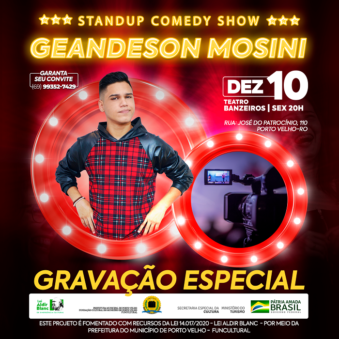 Com 60 mil seguidores no Instagram, o artista rondoniense @geandesonmosini fará show no dia 10 de dezembro, às 20 horas, no Teatro Banzeiros, em Porto Velho. Terá standup, paródias e mágicas.