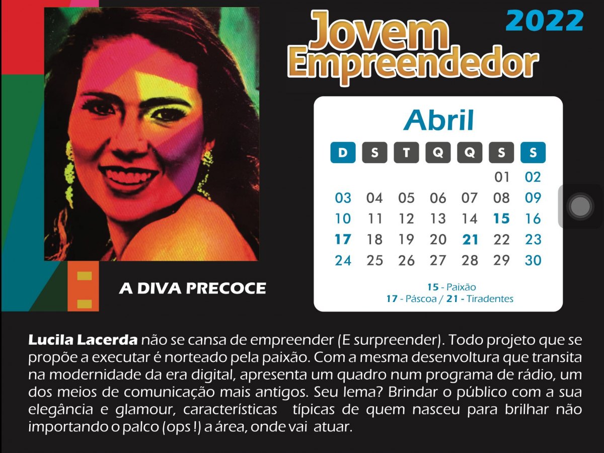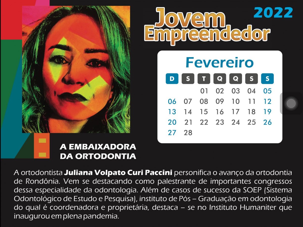 Homenageados - Estão no Calendário Jovem Empreendedor as seguintes obras de arte: Diagnóstico Humanizado ( Analú Barofaldi e Bruno Bernardes) ; A Embaixadora da Ortodontia (Juliana Volpato Curi Paccini); O Presidente ( Everton Melo da Rosa); A Diva Precoce ( Lucila Lacerda); O Caçador de Talentos ( João Albuquerque) A Executiva Premiada (Gabriela Zago ); O Jurista da Dignidade ( Raduan Moraes Brito) Visão de Futuro (Raísa Tavares); O Desbravador das Oportunidades ( André Carvalho); Arquiteta do Sorriso ( Eulécia Casagrande); O Visionário ( Ezequiel Viana) e Empreendedores da Inovação ( Fawez Holanda e Monna Razzak).