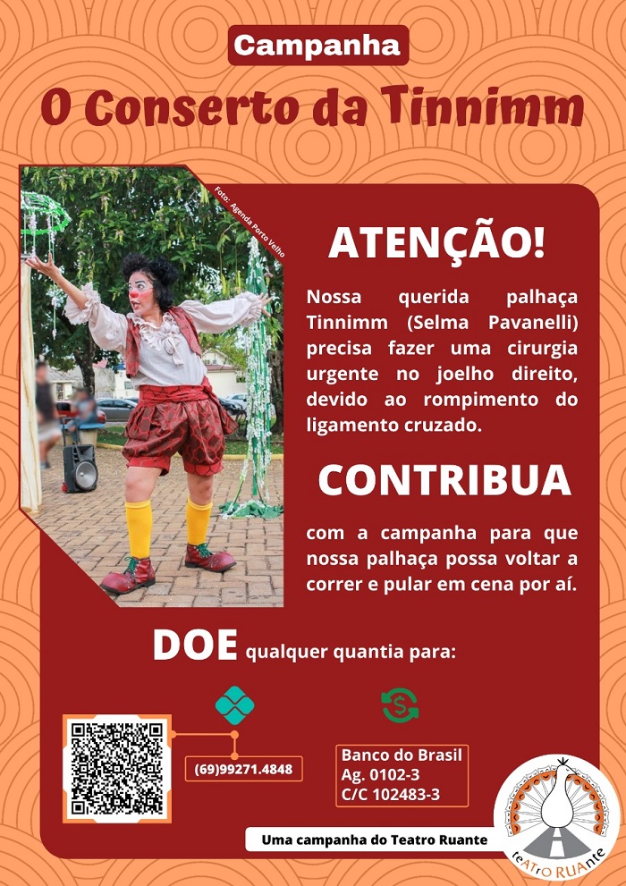 Após cinco anos (05 anos) na fila de espera do SUS para fazer uma cirurgia no joelho direito, a artista circense de Porto Velho Selma Pavanelli (Tinnimm), integrante do Grupo Teatro Ruante, teve o problema agravado e agora precisa se submeter ao procedimento com urgência na rede privada. Ela fará uma cirurgia ligamento cruzado.