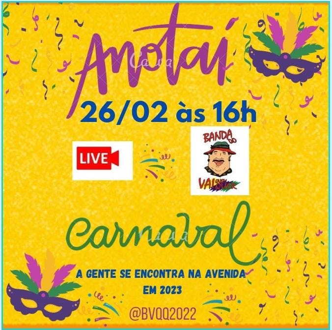 "Por causa da pandemia do coronavírus e em respeito as milhares de vítimas da covid-19, decidimos mais uma vez não aglomerar. Porém, para não passar em branco, vamos realizar uma live para levar um pouco de alegria aos foliões da Banda", destacou a presidente do bloco, Siça Andrade convidando a todos a participar da live da Banda do Vai Quem Quer, de casa acompanhando a transmissão e sem aglomeração.