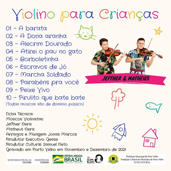Os irmãos violonistas Jefhter Neris, 18 anos, e Matheus Neris, 14 anos, de Porto Velho, Rondônia, lançaram 10 músicas infantis instrumental, entre elas, Dona Aranha, Borboletinha e Peixe Vivo, nas principais plataformas digitais. Todas canções são ao som de violino.