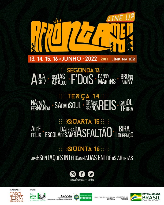 Iniciou nesta segunda,13, e encerra nesta quinta-feira,16, às 20 horas, a transmissão do festival de música “AFROntamento”, através do youtube. O evento trás artistas negros atuantes no nosso estado, todos com trabalhos autorais, mostrando a produção de arte negra independente da nossa região.Veja a programação e onde assistir no final da página.