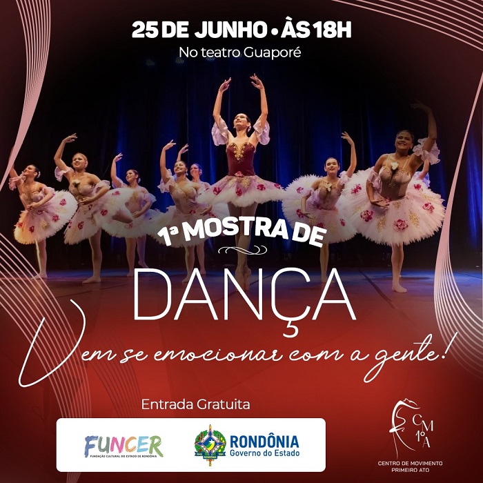 O Centro de Movimento 1º Ato, da professora, bailarina e coreógrafa Ângela Araújo, formada em dança clássica, realiza neste sábado,25, às 18 horas, a I Mostra de Dança da instituição, no Teatro Guaporé, localizado atrás do Teatro Palácio das Artes. A entrada é gratuita e será liberada a partir das 17h30, na bilheteria do teatro.