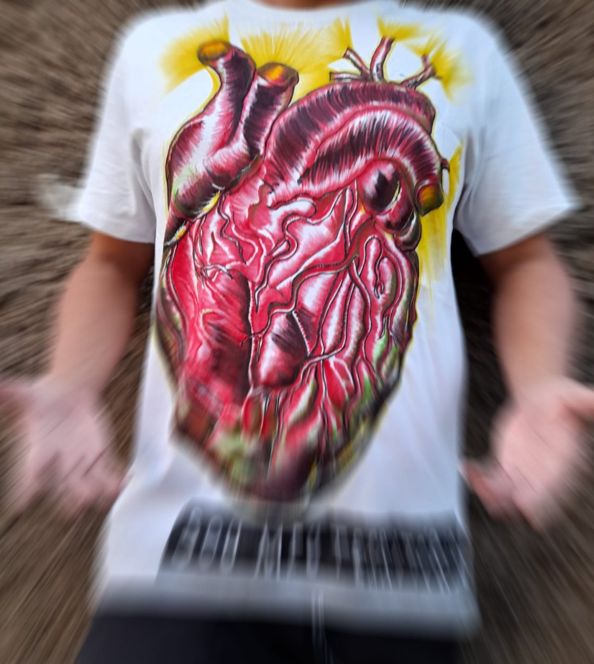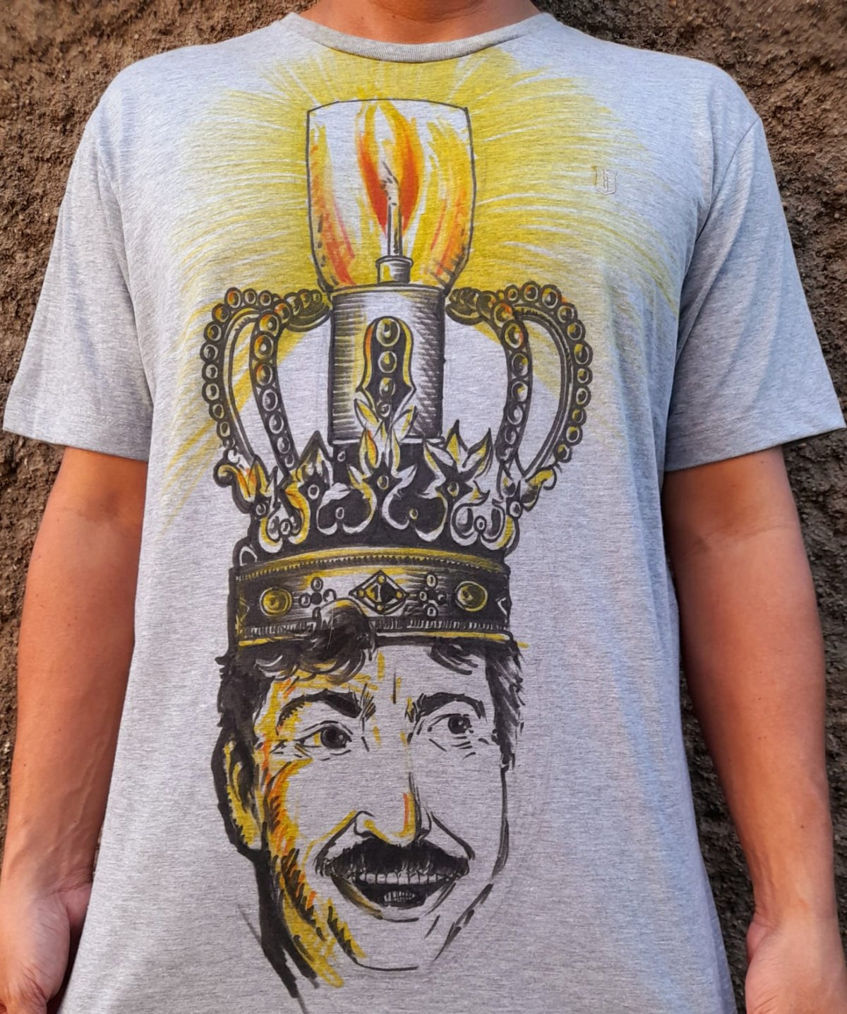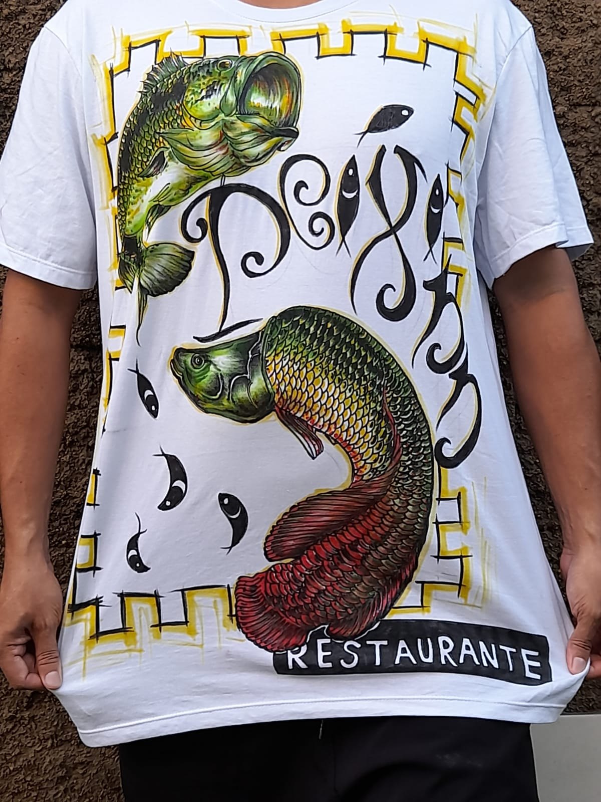 Para executar os desenhos nas camisetas ele utiliza canetas para tecido, já nas telas trabalha com pincéis e espátulas.