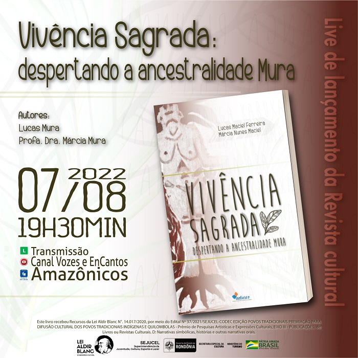 Neste domingo (07), as 19h30min, o público rondoniense poderá conhecer a mais nova produção artística e literária produzida em nosso Estado. A revista cultural: “Vivência sagrada: despertando a ancestralidade Mura” será lançada de forma virtual, pela plataforma do YouTube, através do canal do Coletivo Vozes e EnCantos Amazônicos. A revista foi escrita por Lucas Maciel Ferreira, conhecido por seu nome indígena Lucas Antorokay Mura e se destaca como artista e liderança indígena, e por sua mãe, Dra. Márcia Nunes Maciel, conhecida como Márcia Mura, que é escritora, professora, pesquisadora e liderança indígena.