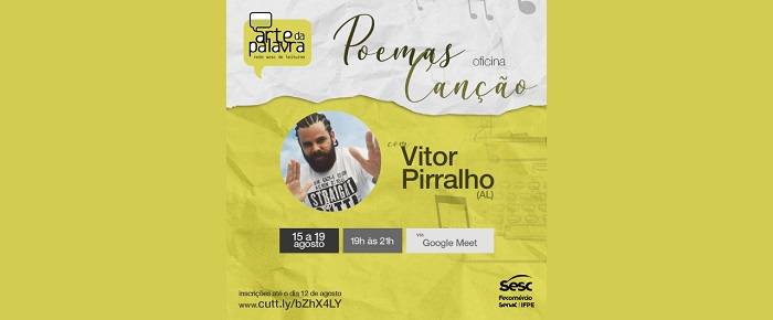 Estão abertas até o dia 12 de agosto as inscrições para a Oficina “Poemas-Canção” – ação formativa realizada pelo Sistema Fecomércio/Sesc/Senac/IFPE, por meio do Sesc Rondônia, que tem como objetivo a análise e desenvolvimento da parte literária contida no meio musical, uma vez que as letras das canções são pertinentes ao âmbito literário. Ministrada pelo professor de literatura brasileira e músico Vitor Pirralho (AL), a atividade acontecerá de 15 a 19 de agosto, das 19h às 21h (horário local), por meio da plataforma Google Meet.