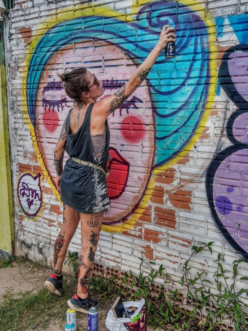 “Acredito que a arte e a música se completam”, afirma a artista visual Dâmaris Felzke da Rosa (@dm.tinta), que refez o trabalho de ilustração no muro do projeto Orquestra em Ação, em Ji-Paraná, que havia executado em 2018 e se encontrava gasto pelo tempo. “Esta ação é uma forma de incentivar os alunos a continuarem a estudar música ou outro tipo de arte”, diz.