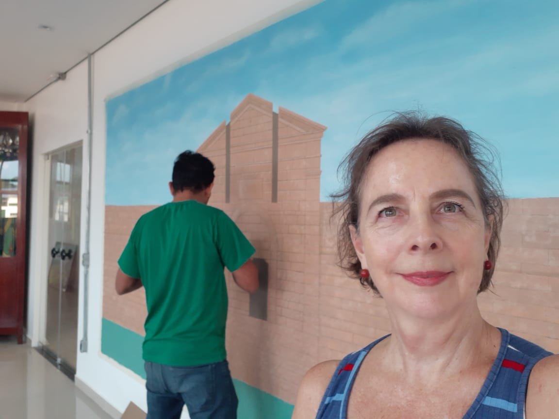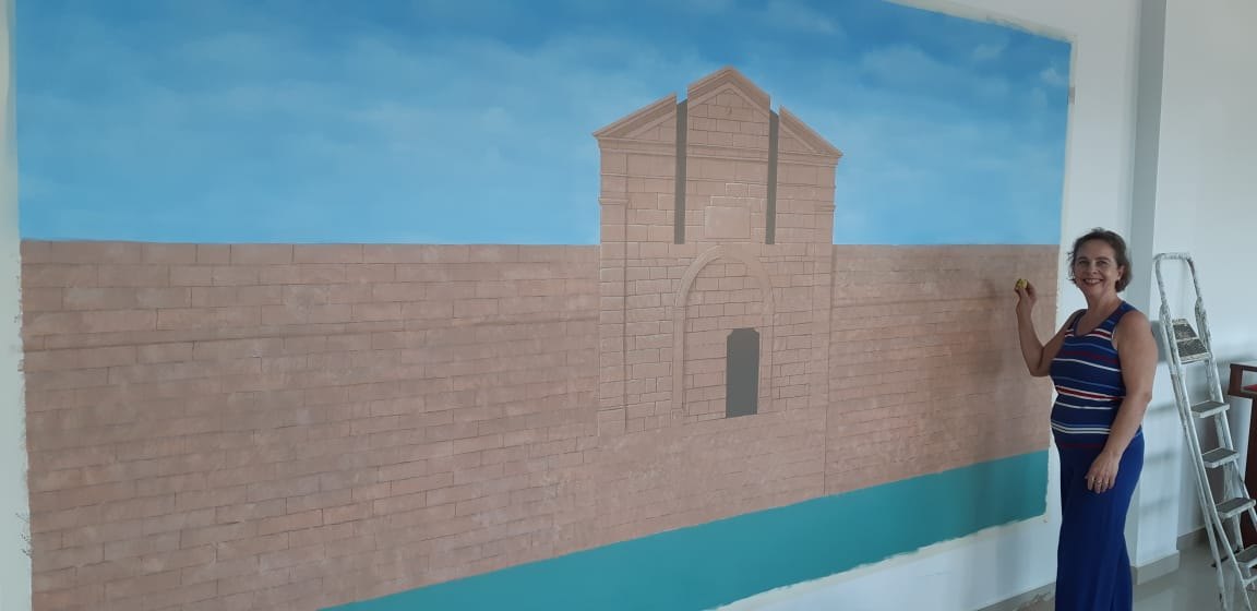 Artista visual Angella Schilling mostra o painel pronto