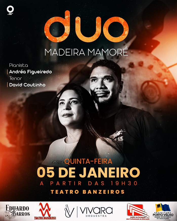 O Teatro Banzeiros, em Porto Velho, recebe nesta quinta-feira,6, o tenor David Coutinho e a pianista Andréa Figueiredo para concerto musical “Duo – Madeira -Mamoré”, às 19h30. Os dois artistas são porto-velhenses, mas atualmente residem em Goiânia e fazem parte da Universidade Federal daquele estado. O repertório será versátil, contemplando desde o gênero erudito, musicais, assim como canções brasileiras e populares. A atividade é aberta ao público.