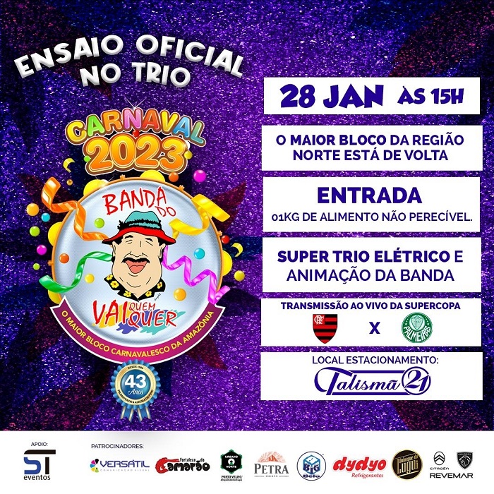 “Estamos com a agenda cheia de novidades esse ano. Pela primeira vez vamos fazer ensaio oficial da Banda na Taslismã 21. É uma oportunidade a mais dos nossos foliões curtirem o Carnaval da Banda. Um verdadeiro esquenta para o desfile”, destacou a presidente da BVQQ, Siça Andrade.