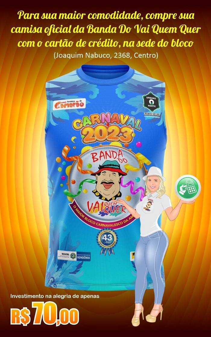 A diretoria da Banda do Vai Quem Quer informa ao folião que deseja comprar a camisa do bloco para o desfile deste ano, que as vendas já estão no segundo lote, ao preço de R$70, cada unidade. A previsão é a de que o segundo lote encerre ainda essa semana por conta da saída do pagamento do funcionalismo público. Pontos de vendas vão ser na sede da BVQQ (Avenida Joaquim Nabuco 2368, Centro), e ST Eventos (Porto Velho Shopping).