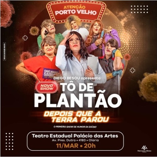A comicidade toma conta do espetáculo "Tô de Plantão", que será apresentado pela primeira vez em Porto Velho pelo enferneiro, ator e humorista Diego Besou, no dia 11 de março, às 20 horas, no Teatro Palácio das Artes. A duração é de 80min.