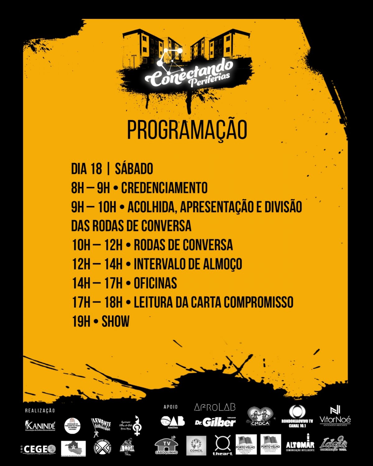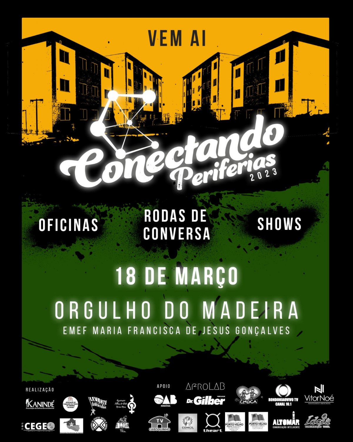 Acontece neste sábado (18) a segunda edição do projeto Conectando Periferias, na escola Maria Francisca de Jesus Gonçalves, no residencial Orgulho do Madeira, em Porto Velho. O evento é gratuito e aberto ao público em geral. Ele iniciará às 8h com rodas de conversas sobre diversos temas, à tarde serão oferecidas oficinas e a noite o evento encerra com shows de artistas locais.