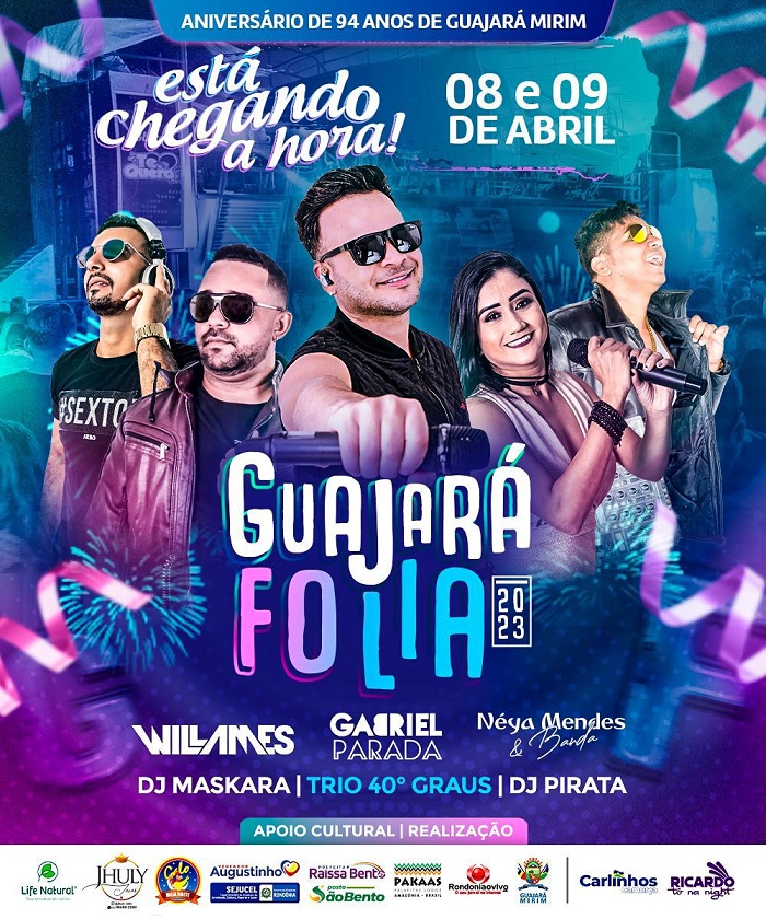 Gabriel Parada, Willames, DJ Maskara, Trio 40 Graus, Néya Mendes e banda, e DJ Pirata são as atrações do Guajará Folia, que acontece dias 8 e 9 de abril, em Guajará-Mirim, município rondoniense que faz fronteira com a Bolívia. O percurso é na Avenida 15 de Novembro, em frente ao estádio João Saldanha. Há oito anos que o evento não era realizado.