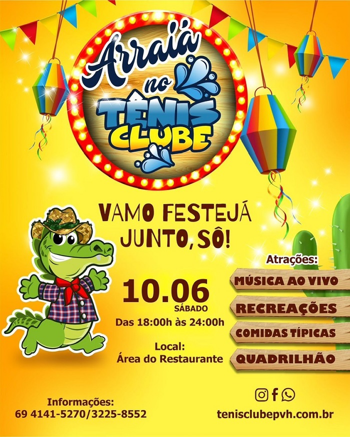 FESTA JUNINA Arraial do Tênis Clube de Porto Velho acontece neste sábado (10) O evento vai contar com brincadeiras infantis, parquinho, pula-pula e terá a presença dos recreadores que devem puxar uma quadrilha e animar a festa