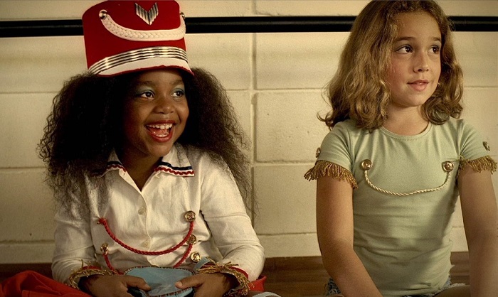 Imagem do filme Cores e botas, a qual mostra duas crianças lado a lado. A menina no canto esquerdo da imagem é negra e está sorrindo. A segunda menina, no canto direito da imagem, é branca e olha para o canto da tela.