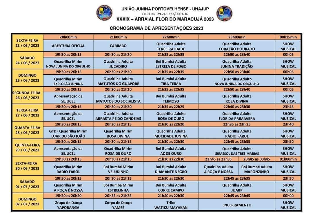 As quadrilhas da Terceira Idade e Coração Dourado se apresentam nesta sexta-feira,22, entre às 22 e 23 horas, durante a abertura oficial do Arraial Flor do Maracujá, em Porto Velho, Rondônia. A noite encerra com show musical.