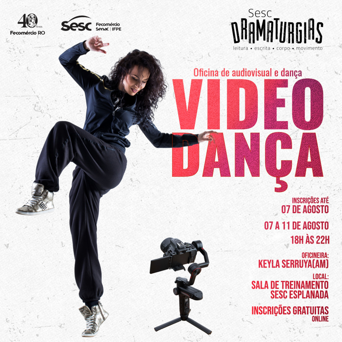 Estão abertas as inscrições para a oficina ‘Vídeo Dança’, por meio do projeto Sesc Dramaturgias, com Keila Serruya (AM). A oficina acontece entre os dias (7) a (11) de agosto, das 18h às 22h, de forma presencial na sala de treinamento do Sesc Esplanada.