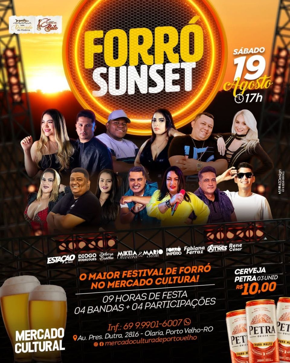 "Este evento músical foi preparado para os amantes de um bom forró", disse o empresário Sinezio Tapajós, permissionário do box Dourado do Madeira, localizado no Mercado Cultural, se referindo ao evento "Forró Sunset", que acontecerá neste sábado, dia 19, a partir das 17h, com shows de quatro bandas e participações de diversos consagrados músicos que vão agitar o palco do espaço público, histórico, cultural e turístico da capital rondoniense.