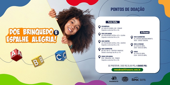 O participante que optar por não doar o brinquedo, pode participar da campanha através da doação, via pix, de R$25,00 reais no e-mail: mesabrasil@sescro.com.br (QR code ao final da matéria)