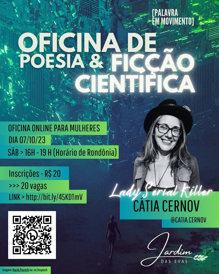Encerram no dia 04 de outubro as inscrições para a Oficina de Poesia e Ficção Científica com a escritora Cátia Cernov. A atividade acontece no dia 07 de outubro, das 16 às 19 horas. A oficina,online, é destinada às mulheres Cis ou Trans a partir dos 18 anos. A ação promovida pelo Coletivo Jardim das Evas.