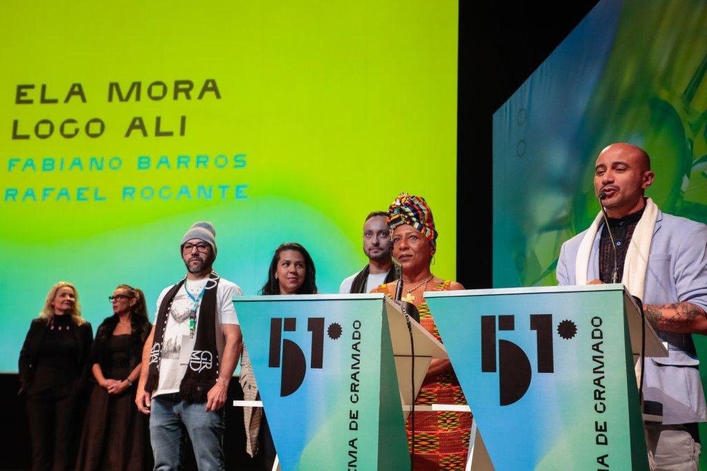 Equipe do filme Ela Mora Logo Ali durante premiação no Festival de Gramado