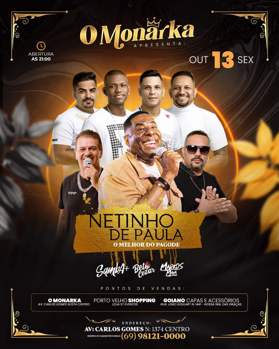 Chegou o grande dia do show de pagode do consagrado músico Netinho de Paula, que acontece nesta sexta-feira, dia 13, a partir das 21h, no O Monarka, com apresentação das bandas locais Samba +, Beto Cezar e Markos Maya.