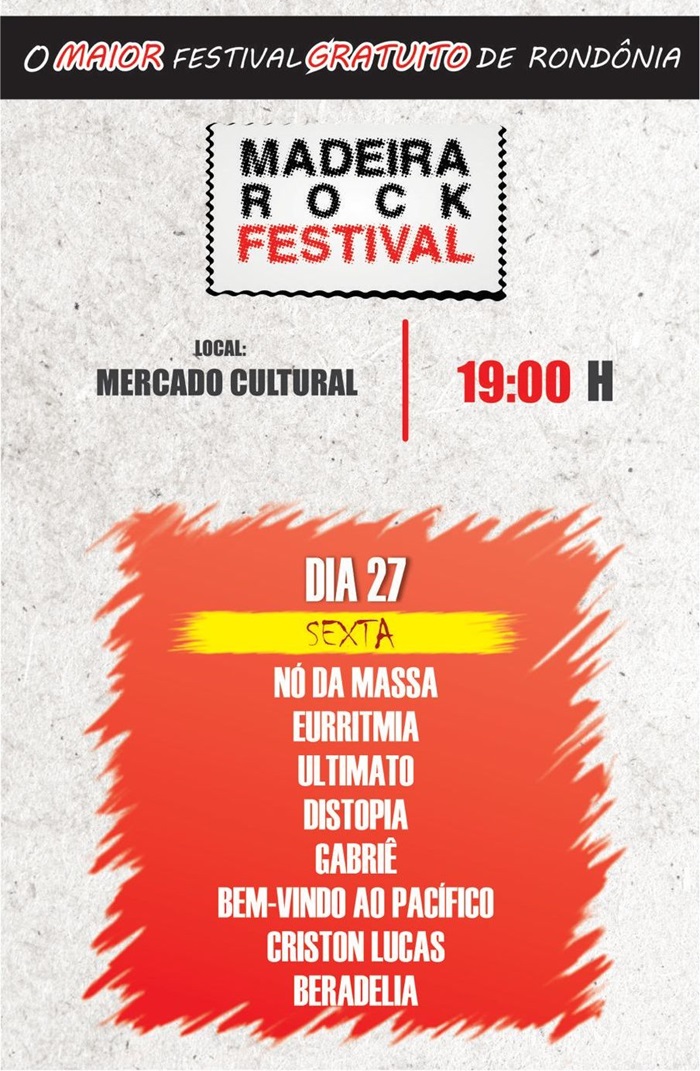 Com entrada franca, o Madeira Rock Festival acontece nesta sexta-feira,27, e sábado,28, a partir das 18 horas, no Mercado Cultural, centro da cidade de Porto Velho. Nos dois dias do evento, pelo menos 16 bandas independentes sobem ao palco.