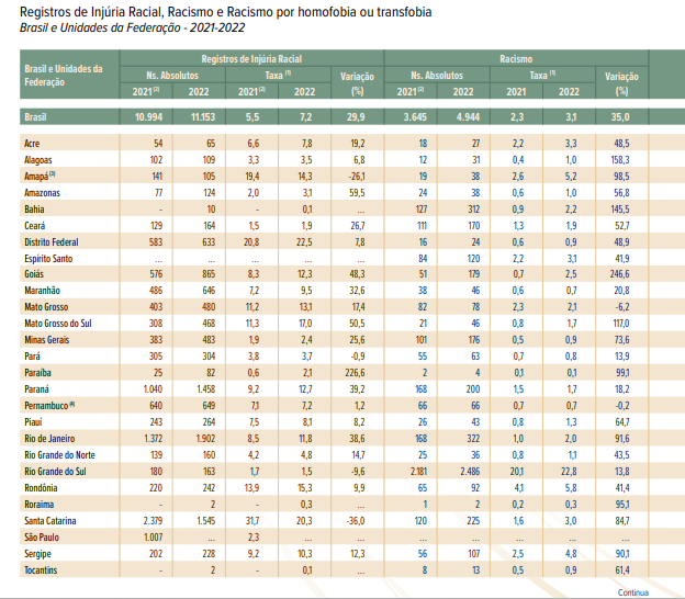 Enquanto o racismo é entendido como um crime contra a coletividade, a injúria é direcionada ao indivíduo. Neste segundo caso, a situação muda: o Distrito Federal tem a maior incidência (633 casos), seguido de Santa Catarina (1.545 casos) e Mato Grosso do Sul (468 casos). Estados como São Paulo e Espírito Santo tiveram alguns dados indisponíveis, no momento da pesquisa, que cruzou números de secretarias estaduais de segurança pública, polícias, dados do Censo do Instituto Brasileiro de Geografia e Estatística (IBGE ) e Fórum Brasileiro de Segurança Pública.