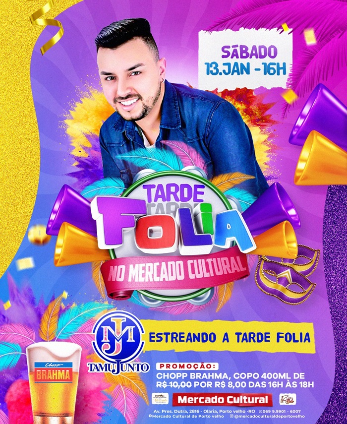 "Está chegando o Carnaval 2024. Para entrar no clima, todos os sábados, a partir do dia 13, após a ‘Feijoada Com Samba e Pagode’ , a festa continua a partir às 16h, com show de grupos de pagode e samba, no palco do Mercado Cultural de Pvh, e você e sua família são os nossos convidados", disse o empresário Sinezio Tapajós, permissionário do box Dourado do Madeira, acrescentando que vai rolar promoção de chopp das 16h às 18h.