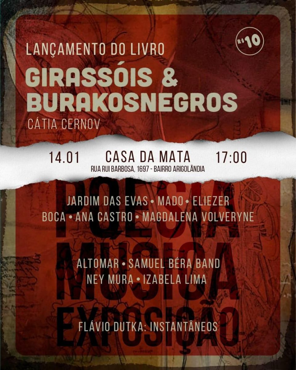 A escritora Cátia Cernov será a estrela da noite no primeiro sarau do ano da Casa da Mata, neste domingo,14, a partir das 17 horas, em Porto Velho, RO. Durante o evento, a escritora lançará o livro de poesia e ficção científica “Girassóis e Burakosnegros”, pela editora Kotter. Cernov fará também uma performance poética.