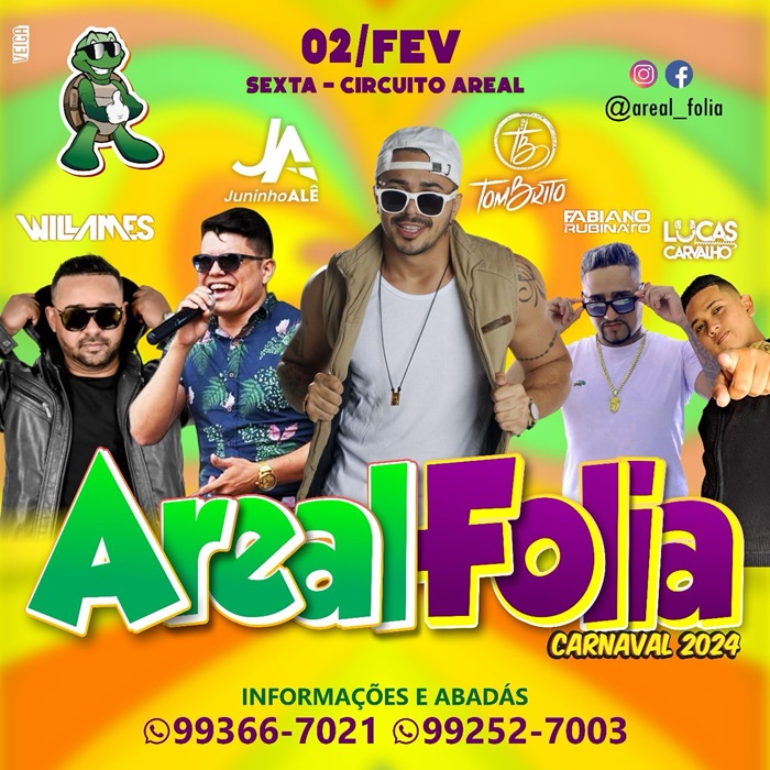 Willames, Juninho Alê, Tom Brito, Fabiano Rubinato e Lucas Carvalho animarão o carnaval do bloco de rua Areal Folia nesta sexta-feira, 02/02, no Circuito Areal Folia.