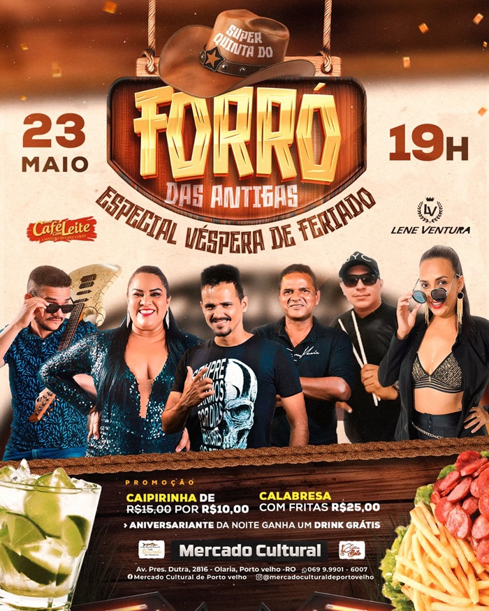 Nesta quinta-feira, dia 23, véspera de feriado, vai ter a 'Super Quinta do Forró das Antigas' no Mercado Cultural de Pvh, com duas atrações, show de Lene Ventura, às 19h, e na sequência, show da banda Café com Leite.