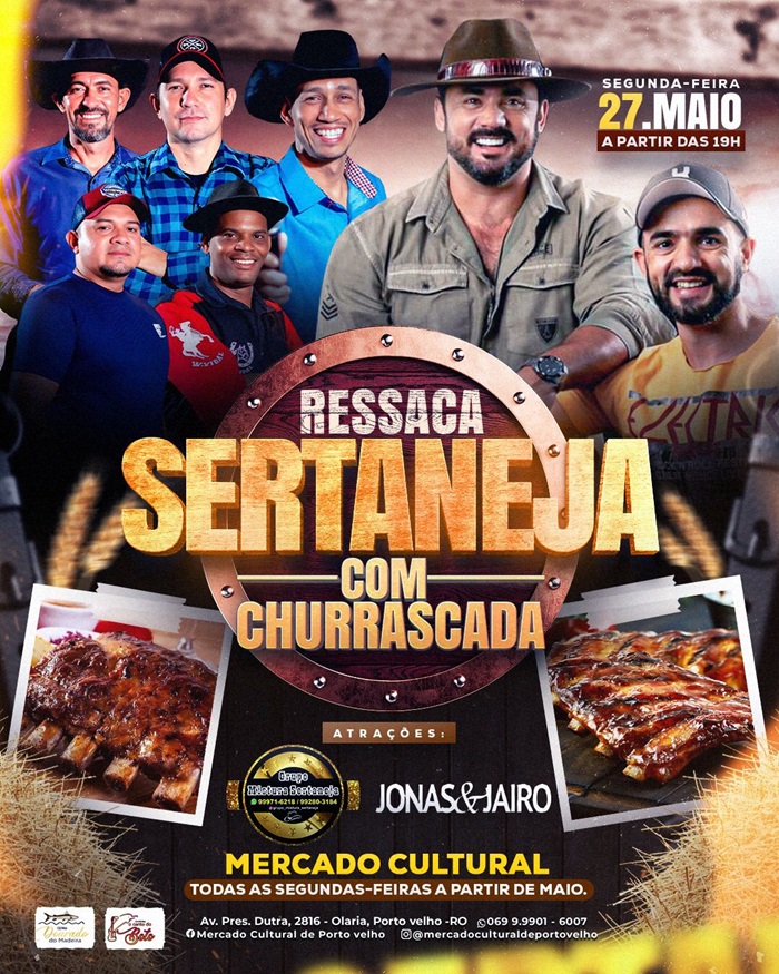 Na considerada melhor noite de segunda-feira da capital rondoniense, a 'Ressaca Sertaneja Com Churrascada', na edição de hoje, dia 27, vai ter show duplo, o primeiro é a partir das 19h, com o grupo Mistura Sertaneja, na sequência, show de Jonas e Jaíro no Mercado Cultural de Pvh.