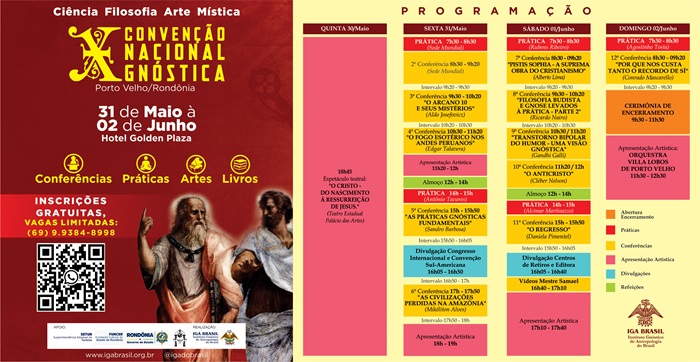 O Instituto Gnóstico de Antropologia do Brasil (IGA), instituição internacional sem fins lucrativos, com sede nos Estados Unidos, realiza nesta sexta,31, e sábado,01/06, a 10ª Edição da Convenção Nacional Gnóstica, no Hotel Golden Plaza. Esta é a primeira vez que o evento é realizado em Rondônia.