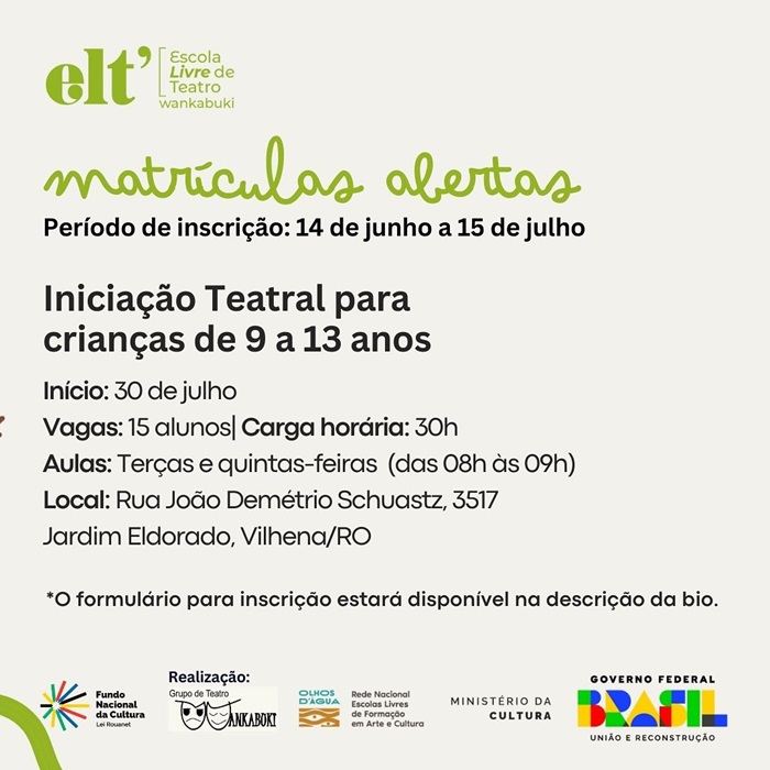 Vilhenenses poderão participar de curso gratuito de teatro que será oferecido pela Escola Livre de Teatro Wankabuki (ELTW), através de projeto do Governo Federal. As inscrições começaram nesta sexta-feira, 14 de junho, e vão até 15 de julho. As aulas presenciais envolverão turmas para alunos de todas as faixas etárias e introduzirão os estudantes no mundo das Artes Cênicas e suas subdivisões, com estudos teóricos e práticos, bem como exercícios de criação.
