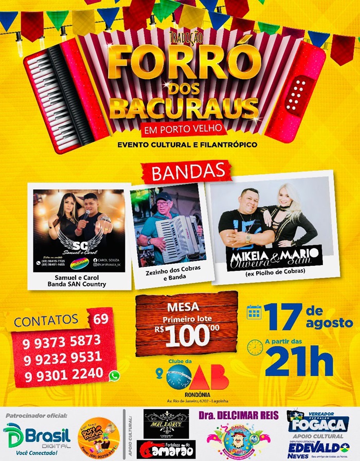 Os ingressos individuais já estão à venda e podem ser adquiridos pelos telefones: (69)- 99373-5873/99232-9531/99301-2240.