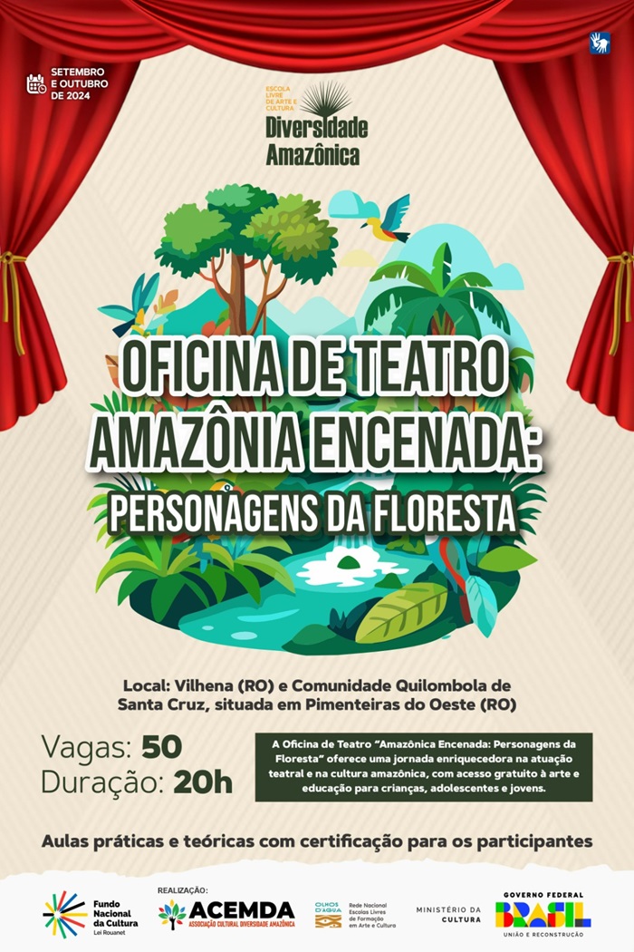 Com 50 vagas disponíveis, a Escola Livre de Arte e Cultura Diversidade Amazônica realizará gratuitamente a oficina de teatro "Amazônia Encenada: Personagens da Floresta". A Escola é coordenada pela Associação Cultural, Educação, Meio Ambiente e Desenvolvimento Sustentável Diversidade Amazônica (ACEMDA).