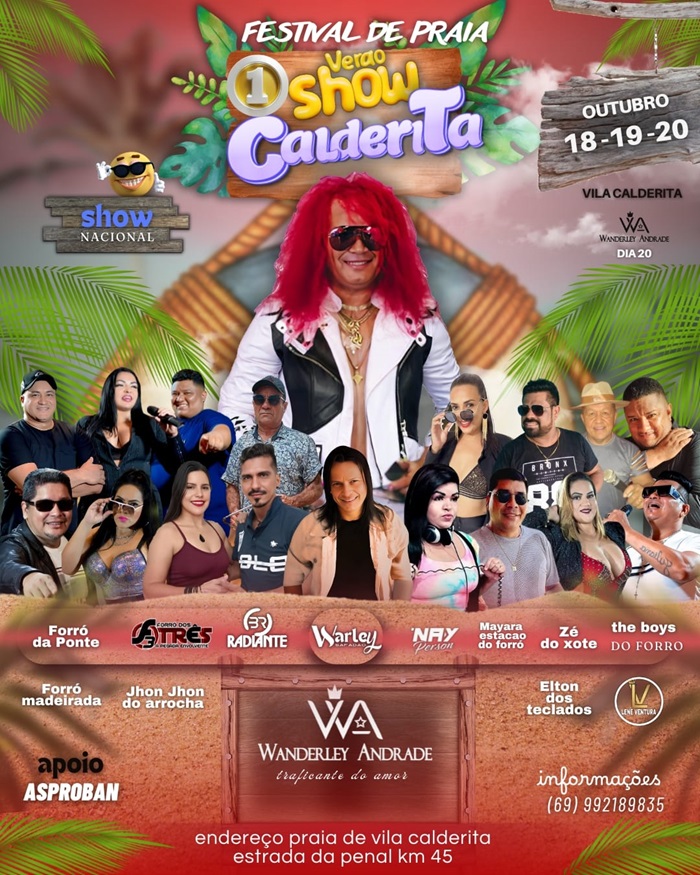 Além do show nacional com Wanderley Andrade, que se apresenta no domingo, 20, último dia do evento, a programação do Festival contará com 12 apresentações de bandas e artistas regionais, com foco no estilo musical de forró e arrocha.