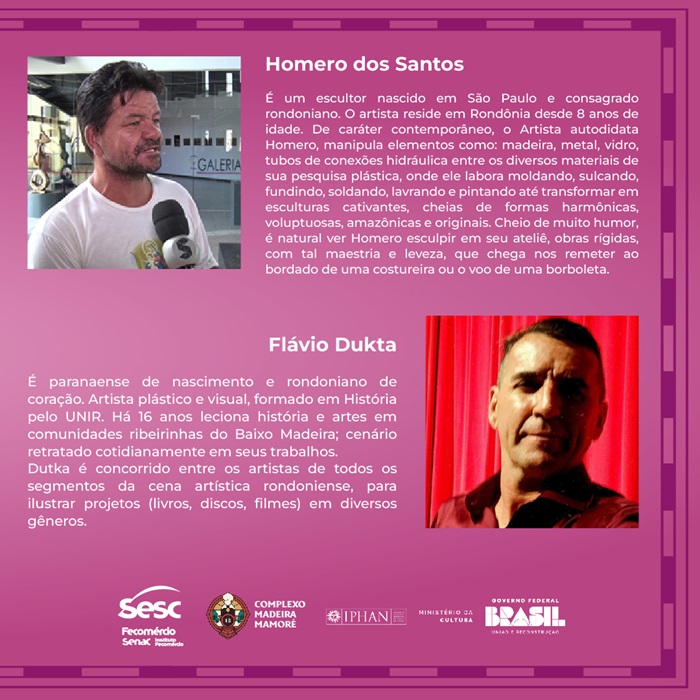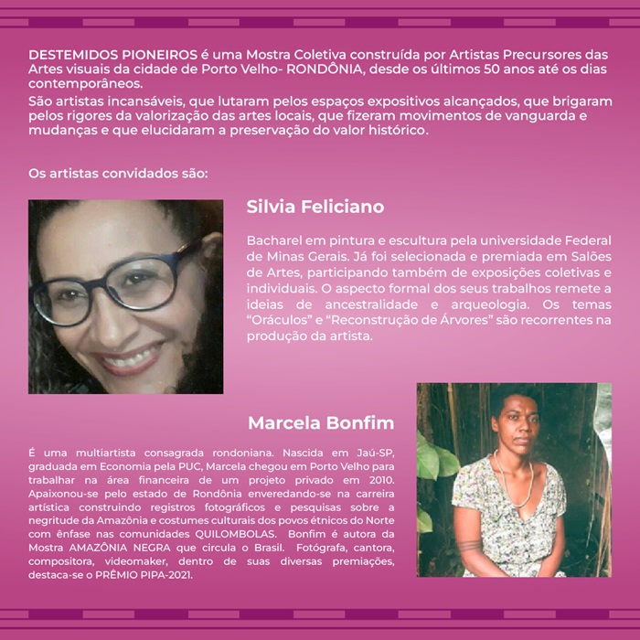 Novos artistas percussores das artes Visuais em Rondônia terão a oportunidade de mostrar as obras em mais uma etapa da mostra ‘Destemidos Pioneiros’. Dessa vez, fazem parte os artistas: Flávio Dukta, Homero dos Santos, Marcela Bonfim e Silvia Feliciano.