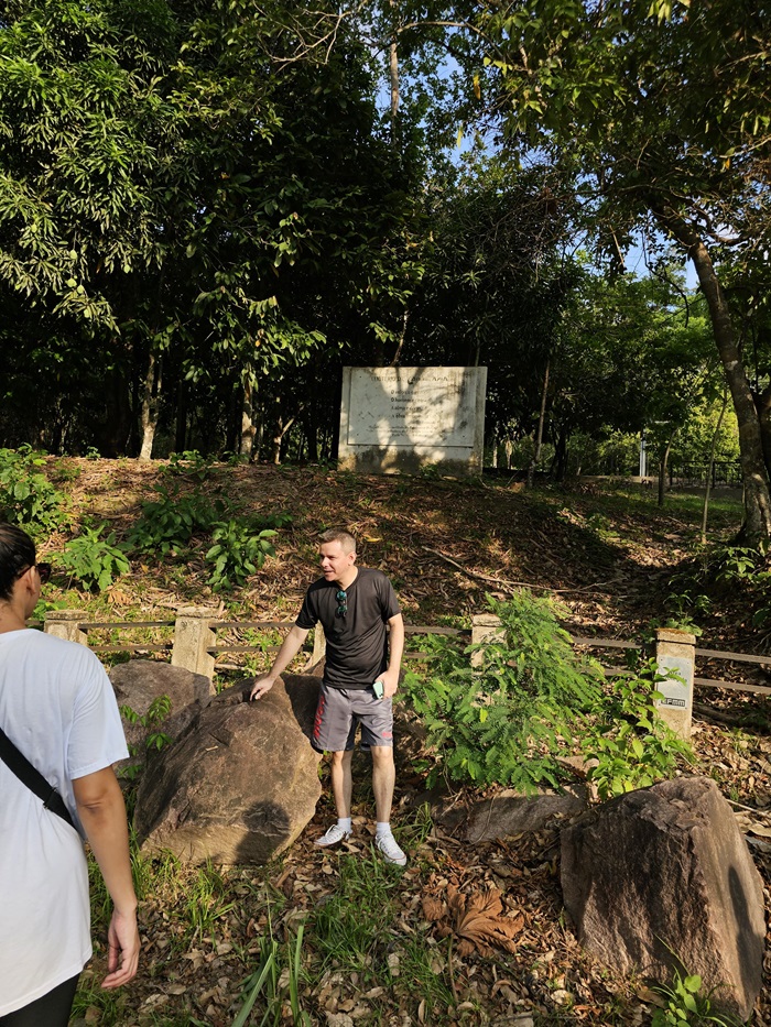 Professor Patric explica sobre a Madeira-Mamoré aos participantes da trilha