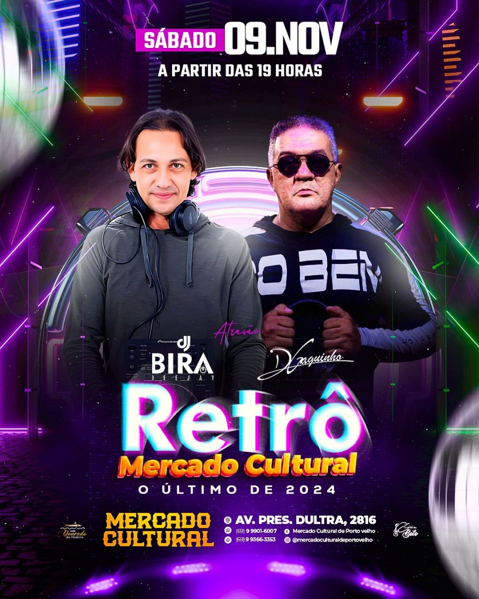 Já à noite, a partir das 19h, terá o evento musical Retrô Mercado Cultural, última edição de 2024, com os DJs Bira Reis e Gaguinho.