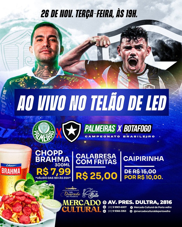 "Além dos shows, iremos montar telões de Led para as transmissões dos dois jogos do Botafogo, o de hoje, contra o Palmeiras, pelo campeonato Brasileiro, e de sábado, contra o Atlético MG, final da Libertadores", comunicou o empresário Sinésio Tapajós, permissionário do box Dourado do Madeira, ao divulgar as atrações musicais da semana que vão acontecer gratuitamente no Mercado Cultural.