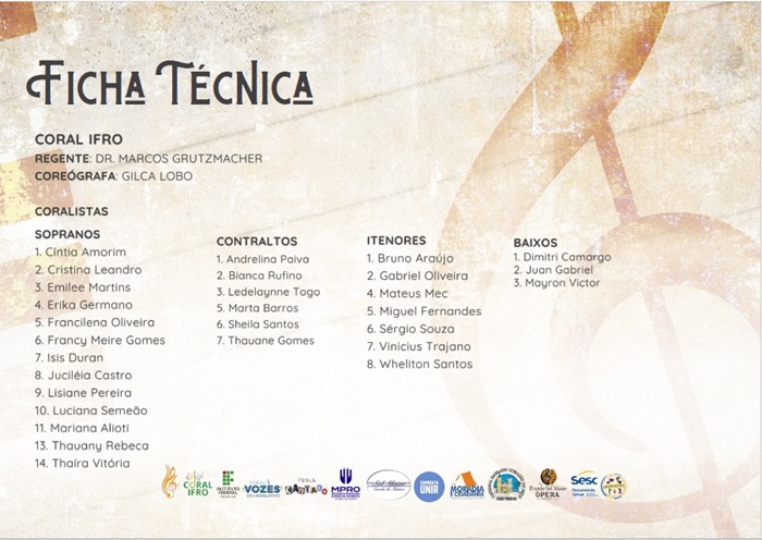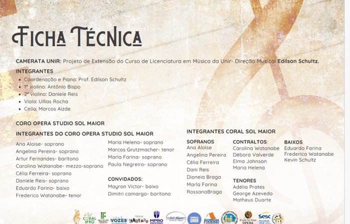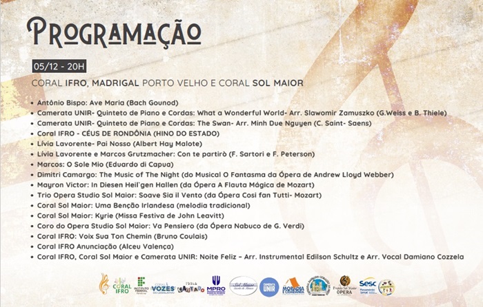 A apresentação desta noite encerra a programação de três dias do projeto: Encontro da Voz, ocorrido no Ifro Zona Norte; recital da Ópera Sol Maior, da Escola de Música Sol Maior e, por fim, o recital de encerramento com coral, solistas e orquestra na Catedral. A atividade é realizada pelo Núcleo de Arte e Cultura do Ifro Porto Velho Zona Norte.